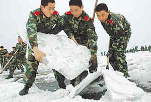 | 武警戰士在銅仁機場奮力除冰。新華社記者