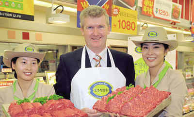 澳大利亞農業部長伯克日前抵達韓國,推動進一步的雙邊貿易和推廣澳大利亞農產品。圖為伯克(中)在韓國首爾一家零售店推銷澳大利亞產牛肉。新華社/法新