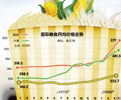 | 資料圖片:國際糧食價格走向 | 糧價飛漲正演變成一場危及全球安全的糧食危機,以美國為首的少數幾個富裕國家正出現強大的食品產業集團和食品聯合體,它們在近幾十年內迅速走向集中。食物集團的手,還進一步伸向投入環節,使得種子、化肥、農藥、機械等多種生產性投入,都一步步走向集中。結果是扭曲了全世界的農業生產和食物體系,并注定了他們在這場危機中成為最大的贏家。 糧價飛漲正演變成一場危及全球安全的糧食危機。以糧食帝國美國為首的少數幾個富裕國家,扭曲了全世界的農業生產和食物體系,在這場不知何時結束的危機中,它們注定是最大的贏家。