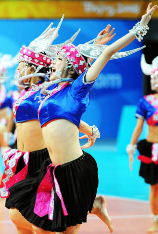 7月20日,志愿者們在進行民族民間舞蹈表演。當日,北京奧運會、殘奧會體育展示與頒獎儀式工作匯報暨誓師動員大會在北京理工大學體育館舉行,集中匯報展示了北京奧運會、殘奧會頒獎儀式服裝及頒獎儀式標準流程、競技拉拉操表演、民族民間舞蹈表演和吉祥物表演等項目。
