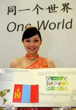 7月29日,一名禮儀小姐在展示蒙古國發行的奧運郵票。當日,由中國集郵總公司發行的《第29屆奧林匹克運動會世界郵票大全》第三冊在廣州市亮相。總共四冊的該郵票大全收集了120多個國家和地區的500多枚郵票,目的是向全世界的集郵愛好者推介奧運文化。