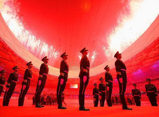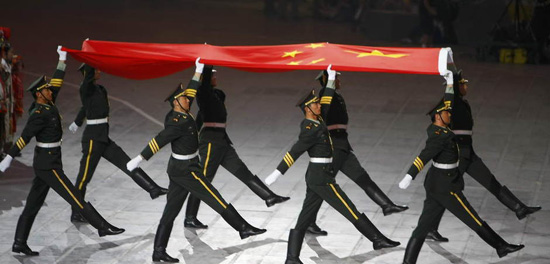 8月8日晚,北京奧運會主體育場。一個高大威武的軍人形象必將永遠定格在中國奧林匹克的史冊之上。在萬眾矚目之下,他先后親手將代表奧運會主辦國的五星紅旗、象征五大洲和全世界運動員在奧運會上相聚一堂的五環旗,冉冉升起在開幕式現場的上空。