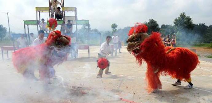 8月9日,村民在表演雙獅搶花炮。