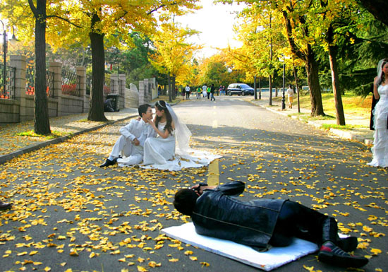 一對戀人在青島八大關景區內拍攝婚紗照。新華社發