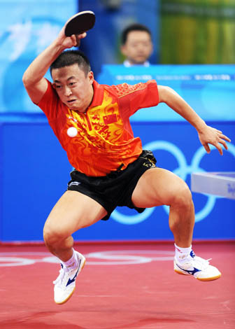 8月16日,中國選手馬琳在比賽中。當日,中國隊在北京奧運會乒乓球男團半決賽中以3比0戰勝韓國隊,挺進決賽,將于18日與德國隊爭奪金牌。