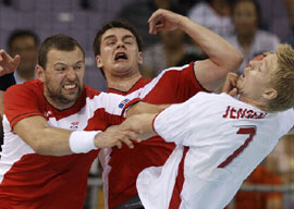 8月16日,在北京奧運會手球男子預賽B組第24場的比賽中,冰島隊以最后4秒得到的七米球追平丹麥隊,戰成32比32。