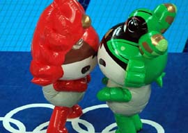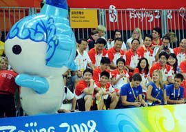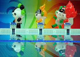 8月17日,福娃為選手助威。當日,北京奧運會女子3米跳板決賽在國家游泳中心——“水立方”舉行。