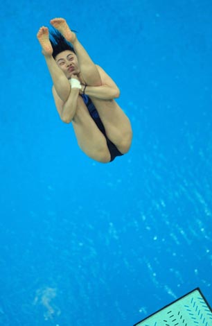 8月17日,中國選手郭晶晶在比賽中。當日,北京奧運會跳水比賽在國家游泳中心——“水立方”繼續進行,郭晶晶在女子3米跳板決賽中以415.35分的總成績獲得冠軍。