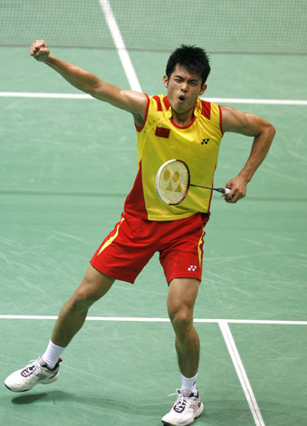 8月17日,中國(guó)選手林丹在慶祝勝利。