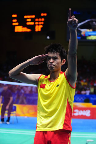8月17日,中國選手林丹獲勝后敬禮向觀眾致意。