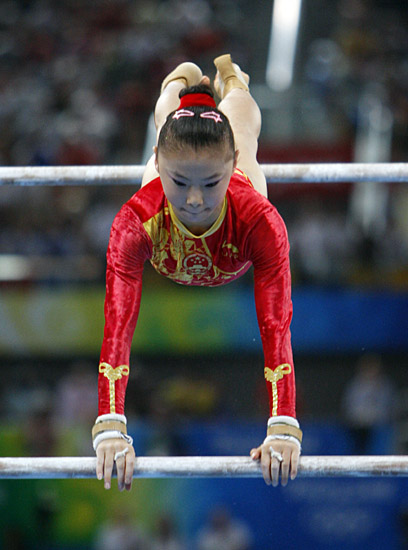 8月18日,中國選手何可欣在高低杠比賽中。當(dāng)日,在國家體育館進(jìn)行的北京奧運(yùn)會體操高低杠決賽中,何可欣以16.725分的成績奪得冠軍。