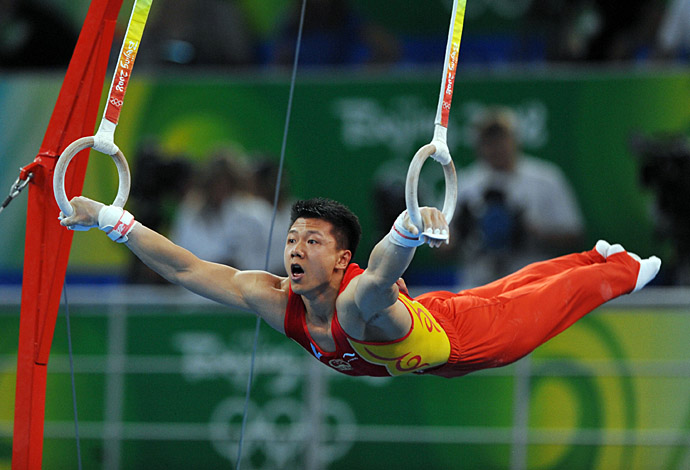 8月18日,中國選手陳一冰在吊環(huán)決賽中。當(dāng)日,在國家體育館進行的北京奧運會吊環(huán)決賽中,陳一冰以16.600的成績奪得冠軍。