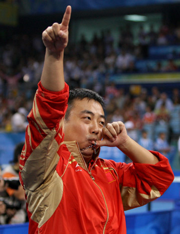8月18日,中國男隊主教練劉國梁賽后親吻項鏈。當日,中國隊在北京奧運會乒乓球男子團體決賽中以3比0戰勝德國隊,摘得金牌。