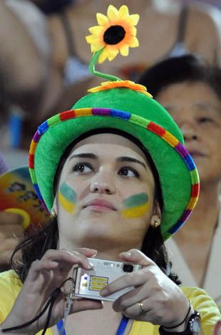 8月18日,巴西球迷。當日,北京奧運會沙灘排球1男子/4決賽結束。