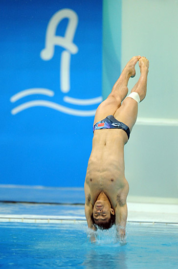8月19日,中國選手何沖在比賽中。當日,北京奧運會跳水比賽在國家游泳中心——“水立方”繼續進行,何沖在男子3米跳板決賽中獲得冠軍。