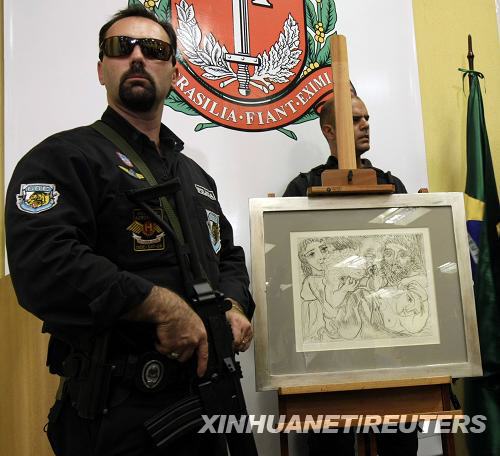 8月18日,巴西警察在巴西圣保羅向人們展示失而復得的畢加索畫作《彌諾陶洛斯、酒鬼和女人》。《彌諾陶洛斯、酒鬼和女人》于6月12日在巴西圣保羅一家畫廊被人偷走,當時失竊的還有其它三幅名畫。新華社/路透