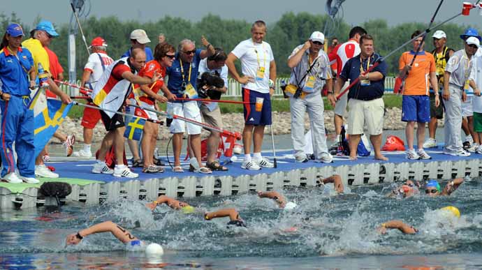 各隊教練正在為參加女子10公里馬拉松游泳比賽的運動員們補充能量。