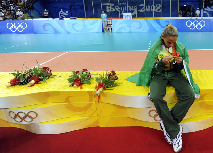 8月23日,巴西隊隊員奧利韋拉一人獨坐領獎臺,端詳金牌。當日,在北京奧運會女排決賽中,巴西隊以3比1戰勝美國隊,獲得冠軍。