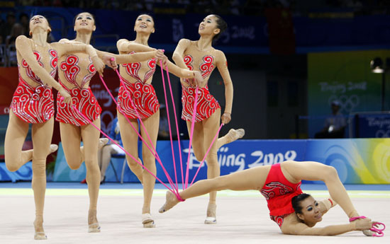 中國藝術體操新的歷史24日在北京工業大學體育館書寫。中國姑娘們在奧運會藝術體操比賽中,以35.225分歷史性地奪得集體全能銀牌,這也是中國藝術體操的首枚奧運會獎牌。 實力超群的俄羅斯隊以35.550分奪得金牌,再次包攬奧運會藝術體操兩金。白俄羅斯隊以34.900分奪得銅牌。 北京奧運會藝術體操項目設個人全能和集體全能兩枚金牌。此前,中國藝術體操的歷史最好成績是亞特蘭大奧運會的第五名。24日的決賽中,中國藝術體操姑娘們在家門口大放異彩。她們動作編排精美,整體配合默契,在首輪5繩比賽中,就奪得第三名,超過主要競爭對手意大利隊0.575分。 次輪3圈+2棒的比賽中,伴著京劇傳統音樂開場,中國姑娘們時而如飛鳥凌空展翅,時而如孔雀驚艷開屏,甜美的笑容打動了全場觀眾?胺Q完美的表現令中國隊得分超過白俄羅斯隊,一舉奪得集體全能銀牌。看著最終的得分大屏幕,中國藝體姑娘們高興地擁抱在一起,哭成一團。她們創造了中國藝術體操新的歷史。 俄羅斯隊在決賽中再次展示了在藝術體操領域的“霸主”地位。兩輪的全場最高分讓她們再次包攬了北京奧運會藝術體操的兩枚金牌。這也是從悉尼奧運會開始,俄羅斯隊連續三屆奧運會實現個人全能和集體全能金牌的包攬。 賽后,中國隊的主力隊員章碩高興地說:“完全沒想到能拿到銀牌。我們創造了中國藝術體操最輝煌的一刻。為了這一刻,我們奮斗了這么久,吃了很多苦。今天,我們做到了最好。今天,所有付出都得到了回報! 對于奪得亞軍,中國隊教練白梅說:“其實,中國隊的姑娘們訓練特別艱苦,每天的訓練都是在超越自己。今天的成績也是她們團結一致、一起拼搏的結果!