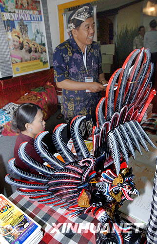 9月11日,在印度尼西亞首都雅加達,一家參展商展出印尼特色木制鷹雕。為期4天的印尼2008年旅游博覽會當天在雅加達舉行,共有12個周邊國家的60多個旅游公司前來觀展。今年1月至7月,印尼共接待外國游客347萬人次,同比增加11.43%。