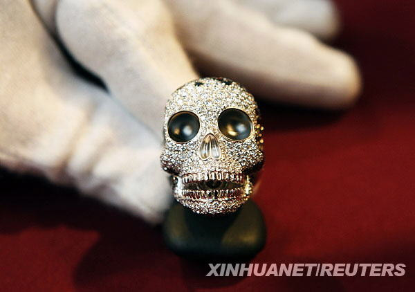 10月30日,在比利時布魯塞爾的超級奢侈品展開幕前 ,工作人員展示一枚打造成骷髏狀的鉆石戒指。這枚戒指價值8560歐元。奢侈品展上亮相的除了珠寶,還有汽車、藝術和時尚類展品。新華社/路透