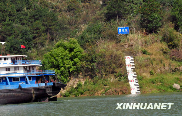 11月3日,一艘輪船從三峽壩上水域一處水位線旁經過。