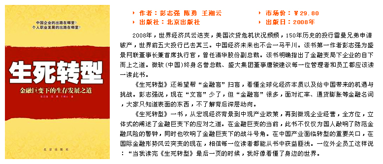 瘋狂的糧價:全球漲3倍,中國怎么辦? 瘋狂的石油價格:四年漲七倍 中長期通貨膨脹趨勢:生死抉擇只在一念間? 通貨膨脹的副產品:銀根緊縮與資金成本上升 金融變局下的企業經營最高法則