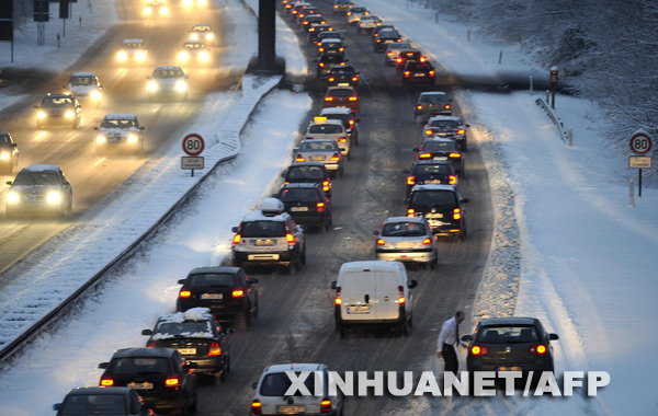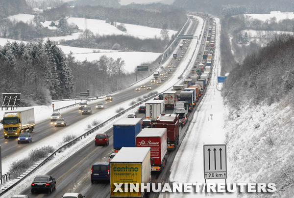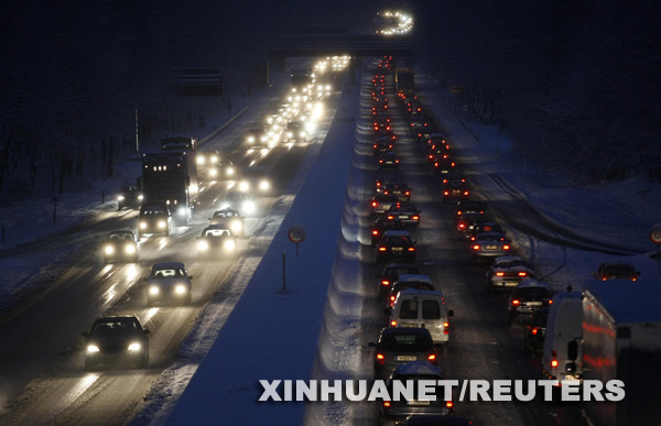 1月5日,在德國波鴻,車輛在公路上緩慢行駛。 當日,德國多數地區降下大雪,積雪厚達20厘米。大雪導致地面交通癱瘓,有些地方車輛排隊長達30公里。勃蘭登堡州一夜之間發生100余起交通事故,造成一人死亡多人受傷。新華社/路透