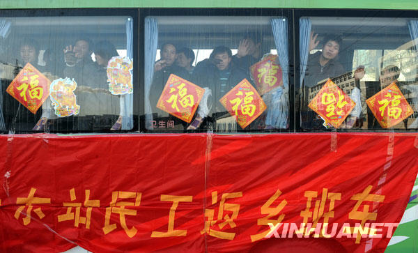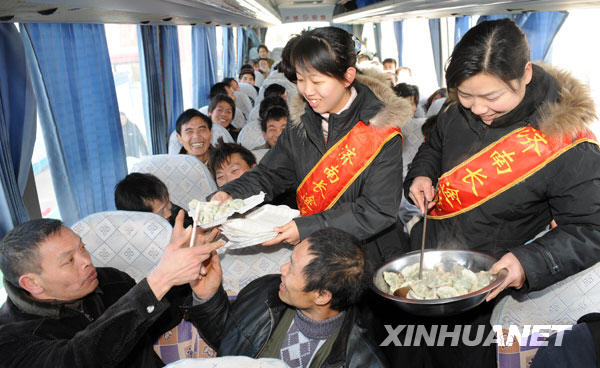 1月14日,交運集團工作人員為農民工送“春運餃子”。當日,山東交運集團開通的“民工返鄉直通車”來到濟南一建筑工地,接送來自貴州安龍鎮的50多名農民工兄弟返鄉過年。在出發儀式上,工作人員為他們送上了對聯、福字和熱氣騰騰的“春運餃子”。