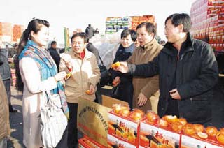 | 衢州市柯城區(qū)委副書記胡松(右二)、柯城區(qū)人大副主任鄭曉霞(右三)、衢州市柯城區(qū)副區(qū)長(zhǎng)王國(guó)強(qiáng)(右一)等衢州柯城區(qū)領(lǐng)導(dǎo)走到北京新發(fā)地農(nóng)產(chǎn)品批發(fā)市場(chǎng)銷售現(xiàn)場(chǎng)向顧客介紹衢州椪柑。 | 由國(guó)際柑橘學(xué)會(huì)主辦、中國(guó)柑橘學(xué)會(huì)和華中農(nóng)業(yè)大學(xué)承辦的第11屆國(guó)際柑橘大會(huì)2008年10月間在武漢召開,會(huì)上發(fā)布,中國(guó)柑橘種植面積和產(chǎn)量目前均躍居世界第一。2008年全國(guó)柑桔普遍豐產(chǎn),預(yù)計(jì)總產(chǎn)量達(dá)2200萬(wàn)噸左右,這年,浙江衢州柯城椪柑種植再獲豐收,產(chǎn)量近40萬(wàn)噸,柑橘是柯城區(qū)農(nóng)民經(jīng)濟(jì)收入的主要來(lái)源,全區(qū)80%的鄉(xiāng)(鎮(zhèn))村主要收入來(lái)源于柑橘,2008年柑桔產(chǎn)業(yè)收入達(dá)4.8億,占全區(qū)農(nóng)業(yè)總產(chǎn)值的54.58%,在農(nóng)民收入中的占比達(dá)到70%。但由于國(guó)際金融危機(jī)的影響,水果消費(fèi)需求下降,柑橘銷售直接關(guān)系到當(dāng)?shù)貜V大桔農(nóng)的切身利益,為此,衢州市柯城區(qū)委、區(qū)政府急桔農(nóng)所急、想桔農(nóng)所想,重拳出擊,區(qū)里領(lǐng)導(dǎo)分別帶隊(duì)于今年春節(jié)前赴北京、哈爾濱、杭州等城市開展“衢州椪柑推介會(huì)”等促銷活動(dòng),促進(jìn)椪柑的銷售。
