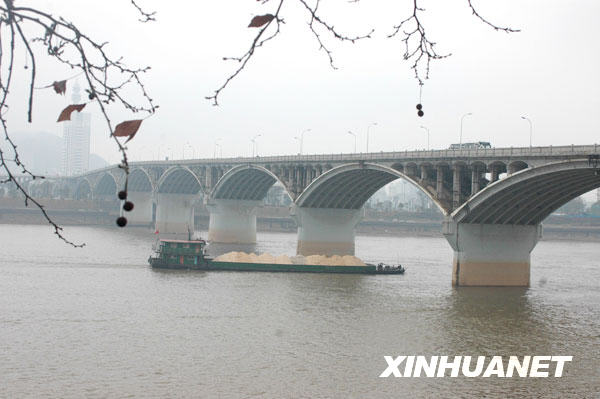 一艘貨輪駛過長沙湘江橘子洲大橋(3月2日攝)。連日來持續的陰雨天氣,使湘江水位不斷上漲。湘江長沙段水位由前段時間枯水期最低的25.23米,3月2日已上漲到27.07米,湘江長沙段告別了持續近3個月的枯水橙色預警。