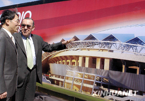 3月12日,哥斯達黎加總統府部長羅德里戈(右)向中國駐哥斯達黎加大使汪曉源介紹體育場的外觀設計。