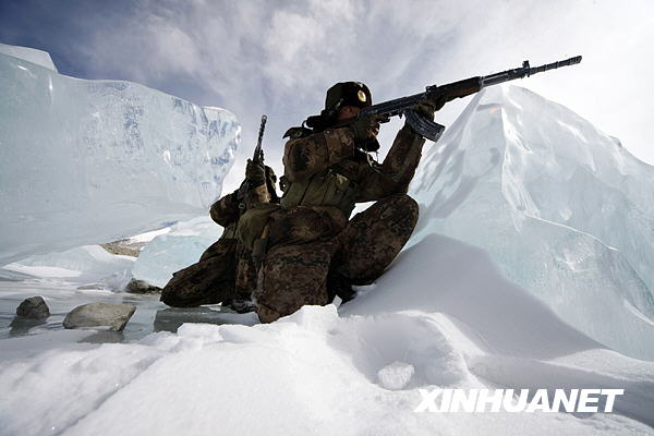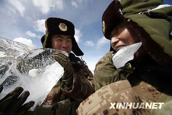 3月22日,官兵們在海拔7546米的幕士塔格峰巡邏途中結合實戰訓練時食冰塊解渴。