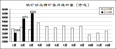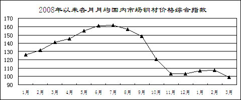 鋼材價格先升后降。受市場預期好轉和銷售企業補充庫存影響,鋼材價格從年初開始小幅回升,2月上旬國內市場鋼材價格綜合指數為109.26,比去年12月最后一周回升5.96點。但由于有效需求沒有明顯恢復而生產增長較快,2月中旬開始鋼材價格持續大幅回落。3月最后一周,國內市場鋼材價格綜合指數為97.16,比2月上旬回落12.1點,低于去年最低水平4.33點。3月份,6.5mm高線、20mm中厚板平均價格分別為3368元/噸和3443元/噸,比去年最低的11月份下降6.9%和2.3%,同比下降33.5%和42.3%;1.0mm冷軋板卷4312元/噸,比去年最低的11月份上漲4%,同比下降34.3%。