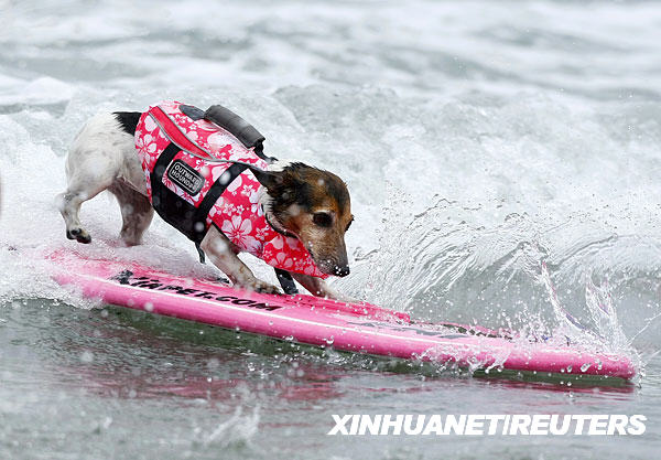9月13日,在美國加利福尼亞州的德爾馬,一只6歲大的小狗體驗沖浪。當天,這里舉辦了一場狗狗沖浪大賽,旨在為流浪動物籌集善款并喚起人們對寵物的愛心和責任感。 |