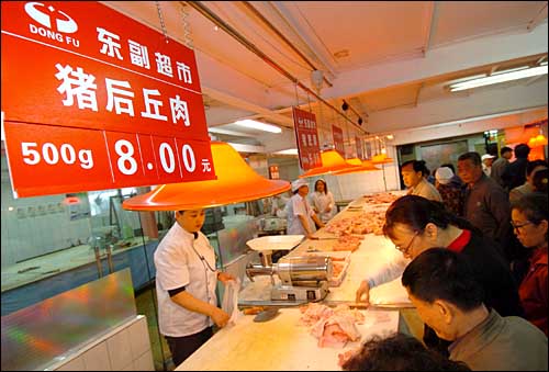 5月23日,市民在沈陽大東副食商場買肉。沈陽市副食集團采取調低所屬超市豬肉價格等措施抑制豬肉價格上揚。從5月23日起,大東副食、皇姑副食等四個超市平均每500克鮮豬肉下浮0.5元至0.8元。
