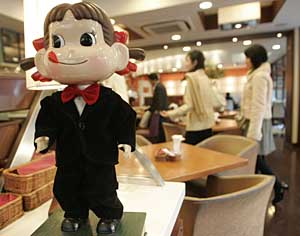 | 早在今年1月份,日本糕點業巨頭“不二家”株式會社就曾公開承認曾出售使用過期原材料制作的糕點。圖為日本首都東京的一家餐廳里擺放著“不二家”的吉祥物“Peko-chan”。新華社/路透 | 當造假已成習慣