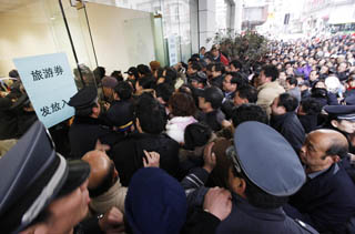3月1日,杭州旅游消費券在上海啟動派發當天,作為派發點之一的九江路杭州銀行上海分行排起了長龍。原定下午2時開始的派發活動吸引了不少市民。臨近中午,主辦方看到排隊市民已達千人,而且人數還在增加,擔心出“狀況”,決定把派發消費券的時間提前到下午1時。 到下午2時,人員仍源源不斷涌來,杭州旅游消費券卻將派發完畢。當工作人員提醒申領者不必再排隊等候時,部分激動群眾強行沖擊側門,哄搶旅游消費券。原本秩序井然的隊伍頓時亂成一團,圍欄被推倒,有人被擠倒在地,手腳受傷。警方拉起警戒線后,主辦方于2時30宣布停止派發活動。一小時后重新向等候在銀行門口的群眾派發旅游消費券,半個小時內發放完畢。 此前,江蘇常州在上海派發消費券時也發生了類似狀況。 然而,南京發放旅游消費券卻遭冷遇。不少獲得旅游消費券的市民不顧其不準買賣的規定,將100元價值的旅游消費券在網上以50元甚至更低價格轉讓。 旅游消費券發放,為何遭遇“冷”“熱”兩重天?對此,網民各抒己見。網友KA抱怨說,旅游券發放不夠“實惠”,噱頭大于實際意義。“雖然旅游券可以每40元抵用10元,但出門旅行各項花費遠遠超過所得到的實惠”。“旅游消費券其實刺激不了消費,原因很簡單:在乎消費券那點小便宜的人沒什么消費能力,真正有消費能力的人不會去湊那個熱鬧。”網友euro2k認為,消費券沒發到合適的人手中,結果是白費勁。