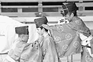 | 十四日,兩名東京明治神宮的神官為一名年滿二十歲的年輕人行“冠禮”。新華社記者 任正來