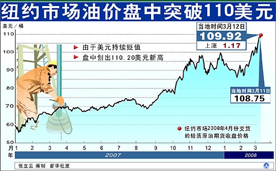 由于市場對西方央行最新注資行動的效果仍存疑慮,加上新數據顯示歐元區經濟基本面穩健,12日紐約匯市美元對多數其他主要貨幣比價回跌,其中對歐元比價再探新低。當天紐約匯市尾市時,歐元兌美元比價從前一交易日的1比1.5319升為1比1.5526,盤中曾創下1比1.5559的新高。英鎊兌美元比價從1比2.0029升至1比2.0243。 受美元貶值影響,12日紐約商品交易所4月份交貨的輕質原油期貨價格每桶上漲1.17美元,收于109.92美元,盤中最高沖至110.20美元,再次刷新盤中和收盤兩項紀錄。今年以來,紐約商交所指標原油期貨均價達到每桶95.12美元,比去年初上漲65.5%。倫敦國際石油交易所4月份交貨的北海布倫特原油期貨價格每桶上漲1.02美元,收于106.27美元。 另據石油輸出國組織(歐佩克)秘書處12日發布的報告,歐佩克市場監督原油一攬子平均價11日達到了每桶100.57美元。這是歐佩克日平均油價首次沖破每桶100美元大關,在不足兩個半月時間里已9次刷新歷史紀錄。
