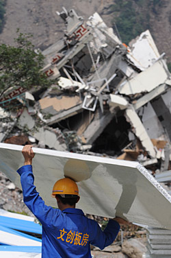 | 6月5日,工人們在汶川映秀鎮加緊建設活動板房。新華社記者 武巍