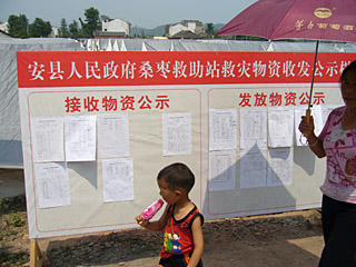 6月2日,都江堰市聚源鎮(zhèn)受災(zāi)群眾集中安置點(diǎn)。 這里與教學(xué)樓整體垮塌的聚源中學(xué)只有一河之隔。附近鎮(zhèn)上所有房屋成了危房或已坍塌的居民都臨時(shí)搬到這里。隔河望去,一排排藏青色的民政救災(zāi)帳篷整齊如軍營(yíng)。 正值中午時(shí)分,帳篷里的人多外出辦事了,守在帳篷內(nèi)的多是婦女和老人。一對(duì)年輕夫婦正推著嬰兒車(chē)準(zhǔn)備外出,一位上了歲數(shù)的大爺含一支煙袋,正外出遛鳥(niǎo)。帳篷中,人們的生活正以一種別樣的方式在繼續(xù)。 自阿壩州養(yǎng)路段退休的吳顯才與老伴袁桂華正在河邊的林蔭下休息,身旁還有孫子。他們都穿著企業(yè)捐贈(zèng)的短袖衫,手中各喝著一瓶農(nóng)夫山泉礦泉水。吳顯才說(shuō):“我們家的房子在鎮(zhèn)上街邊,120平方米的房子全塌了。屋里的東西搶出來(lái)一些,電視也不知壞沒(méi)壞。” 盡管戶(hù)口不在這里,他們還是領(lǐng)到了瓶裝水和快餐面。一些外地來(lái)的志愿者還給分發(fā)了常備物資,如感冒藥、藿香正氣水、衣服等。說(shuō)著,他還指著自己穿的衣服說(shuō),上邊都標(biāo)有太極藿香液的字樣。據(jù)說(shuō),這家企業(yè)向?yàn)?zāi)區(qū)發(fā)放了10萬(wàn)件衣服,見(jiàn)人就發(fā)。 聚源鎮(zhèn)8大隊(duì)1小隊(duì)的村民楊中芳說(shuō),他是本地戶(hù)口,救災(zāi)物資只要來(lái)了,都有他們的份兒。家中發(fā)了夠10天吃的餅干,還有足夠喝的純凈水,20桶方便面。地震后的5天里,每天都會(huì)領(lǐng)到救災(zāi)用的食品和水,后來(lái)隔幾天發(fā)一次。 在聚源鎮(zhèn)集中安置點(diǎn),住在22號(hào)帳篷的李蓮剛泡了一包方便面,準(zhǔn)備吃午飯。她對(duì)記者說(shuō),他們現(xiàn)在3家人住在一個(gè)帳篷里,現(xiàn)在有幾千人住在這個(gè)安置點(diǎn)。記者看到,帳篷內(nèi)有成堆的救災(zāi)物資,有成箱的礦泉水、方便面、牛奶等。在靠近門(mén)口的一角,還堆著大米等成袋物資。李蓮說(shuō):“平時(shí)主要吃稀飯、餅干和方便面,也上街買(mǎi)菜,菜價(jià)與平時(shí)一個(gè)樣,只是魚(yú)價(jià)漲了。” 6月5日,在綿陽(yáng)市安縣睢水鎮(zhèn)幼兒園,正趕上鎮(zhèn)領(lǐng)導(dǎo)一班人在一個(gè)救災(zāi)帳篷內(nèi)研究工作。他們正在傳達(dá)一份“特急”文件,要求救災(zāi)物資的管理臺(tái)賬一定要建立起來(lái),各鄉(xiāng)鎮(zhèn)每個(gè)部門(mén)、村民委員會(huì)都要建立公示救災(zāi)物資發(fā)放制度,接受社會(huì)監(jiān)督。 對(duì)于救災(zāi)物資登記發(fā)放工作,睢水鎮(zhèn)黨委書(shū)記馮德強(qiáng)說(shuō):“最開(kāi)始,特別是震后前幾天,物資來(lái)源復(fù)雜。我們更多是做好災(zāi)民的安置,讓受災(zāi)群眾有東西吃,有地方住,有水和藥品。由于人手少,物資管理有些亂。” 馮德強(qiáng)說(shuō),但5月17日后,物資管理關(guān)口開(kāi)始把嚴(yán)了,大宗物品均有村里簽字。救災(zāi)物資都是現(xiàn)場(chǎng)統(tǒng)一配給,鄉(xiāng)鎮(zhèn)直接到發(fā)放點(diǎn)領(lǐng)取,各個(gè)村從鄉(xiāng)里領(lǐng),小組再到村里領(lǐng)。其中,像帳篷、膠布、被子等容易清點(diǎn)的大宗物資把得很?chē)?yán),但像方便面等一些不好清點(diǎn)的物資,百姓不可能等著你清理好再領(lǐng),所以具體數(shù)量上有些亂。 現(xiàn)在,全鎮(zhèn)6000來(lái)戶(hù)家庭,大概領(lǐng)到900多頂帳篷,都發(fā)放下去了,重點(diǎn)是解決山上受災(zāi)最重的群眾。目前,帳篷缺口在1000頂左右。 6月5日,記者來(lái)到安縣桑棗救助站,這里臨時(shí)居住著2000多名受災(zāi)群眾。來(lái)自安縣茶坪鄉(xiāng)的劉剛說(shuō),他們一個(gè)帳篷內(nèi)住了3家14個(gè)人,平時(shí)吃免費(fèi)食堂,一般兩個(gè)素菜,偶爾還有肉吃,大米管夠。 民政部6月1日頒布了《汶川地震抗震救災(zāi)生活類(lèi)物資分配辦法》,規(guī)定物資發(fā)放點(diǎn)要吸收受災(zāi)群眾推選的代表參與生活類(lèi)物資的發(fā)放和管理工作,實(shí)行收發(fā)“實(shí)名制”。記者看到,在桑棗救助站內(nèi),已設(shè)有專(zhuān)門(mén)的接收發(fā)放救災(zāi)物資公示欄,上面清楚地登記著有受災(zāi)群眾簽字的領(lǐng)取物資明細(xì)。