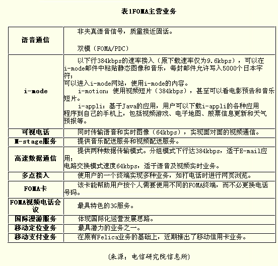 DoCoMo在3G市場推出的品牌是FOMA,其在運營方面最大的特點是與其2G的i-mode業務緊密結合,使得FOMA的數據業務不僅從其原有PDC網絡i-mode數據業務獲得了繼承,而且在原有i-mode的基礎上增強了許多功能。NTT