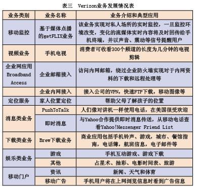 EV-DO網絡16個月后,推出了主要面向個人用戶的3G數據業務“Vcast”,為用戶提供基于電視、短片等內容的流媒體業務。Verizon成為美國第一個推出商用高速數據網絡和第一個實現手機無線下載應用的運營商。有關專家預測,根據美國年輕用戶市場的特點,移動音樂下載和移動游戲業務將會在美國獲得快速發展。Verizon業務提供見表三所示。